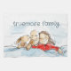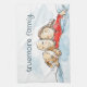 Esta toalla de cocina tiene el ilustracion de un adorable cachorro y sus padres, un calvo y una morena. Puede personalizar del texto.