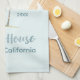Trae albornoces de playa a tu cocina con esta moderna toalla costera. Con palmeras azules, textura de madera y un nombre de personalizable, año establecido y diseño de la ubicación.