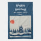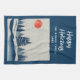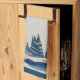 Paisaje invernal Bosque Azul Luna Rojo Azul Dibujando Toalla De Cocina Vacacional. Tranquilo paisaje de nieve de invierno con bosque. Felices vacaciones en un guión de moda. Personalizó el texto.