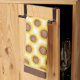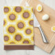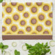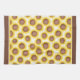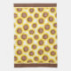 Toalla de cocina de diseño de girasol de bonito diseñada con girasoles adorables con centros marrones punteados, y rayas marrones y amarillas a lo largo de los bordes superior e inferior. Esta toalla de cocina de girasol es perfecta para los amantes de los girasoles y los accesorios de girasol y la decoración de la cocina.