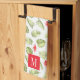 Toalla de cocina blanca monogramada con un monograma rosa un diseño de patrón de hojas de palma botánicas verdes y flores exóticas rosas.