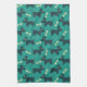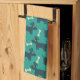 Una toalla de cocina diseñada con un patrón repetitivo, con una linda garganta sonriente con las orejas de los disquetes y un hueso de perro. Fondo verde.