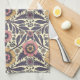 Esta toalla de cocina está decorada con flores y hojas en tonos rosa y azul sobre un fondo color crema.