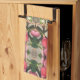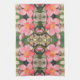 El patrón floral rosa de esta toalla de cocina de ZoeSPEAK fue creado a partir de una fotografía original de flores y capullos de jatrofa rosados floreciendo en el jardín. La foto de cierre muestra el centro amarillo de la flor en medio de los pétalos rosados. Las hojas verdes de la flor sobre un fondo beige terminan el patrón.