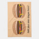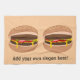 Añade un lema o nombre para crear un regalo personalizado con un tema de hamburguesa. La imagen muestra una hamburguesa de queso doble con queso fundido, anillos de tomate y jeringuillas.
