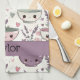 Enhance your kitchen décor with this absorbent, personalized tea towel! It features the beautiful all-over pattern of adorable, smiling kitchen utensils and delicate pink/purple roses and lavender sprigs. The gentle color palette evokes a sense of nostalgia and charm. Customize this beautiful design with your family name or "Baker's Kitchen" for a thoughtful hostess or housewarming gift. This towel coordinates perfectly with the Mommy & Me apron collection.