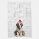 Here's a fun holiday kitchen towel or year-around hand towel. An adorable watercolor illustration of a cute Saint Bernard Santa dog who sits with a fun 'woof' word art background. The dog wears a Santa hat.