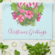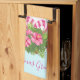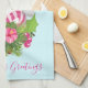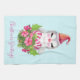 Toalla de cocina con un diseño tierno y caprichoso con un adorable pingüino vestido con un sombrero rojo de santa. Detrás de un ramo de flores con caramelos de rayas rosas y blancas.
