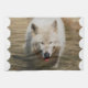 White Wolf que vadea en el agua poco profunda para una bebida.
