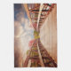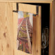 Una toalla de cocina con una fotografía panorámica. Un puente de madera que conduce a un camino rodeado de árboles que cambian de color.