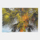En un ambiente tropical, la fotografía original de MaeFlowers en esta toalla de cocina muestra la parte superior de una palmera con sus ramas y el tronco bañados en el cálido resplandor del sol de la tarde. Las ramas largas y puntiagudas en el fondo son de color verde oscuro, y se extienden como fans. Las ramas en primer plano son de color amarillo claro, curvándose hacia el exterior mientras captan la luz del sol. El tronco del árbol, normalmente de color marrón medio, parece casi naranja a última hora de la tarde. Un fondo azul pálido del cielo azul acuático separa los ricos tonos tierra de la palmera y completa la escena tropical.