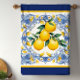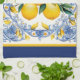 Toallas de cocina de azulejo mediterráneo y ramo de limón bonito. Hermosos limones en un fondo de azulejo mediterráneo azul y blanco. Puedes agregar texto para personalizar.