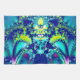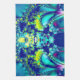 Toalla de cocina abstracta con arte fractal en colores vivos: azul, cian, verde neón y morado.