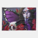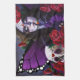 Un hada en un día de cráneo de azúcar del maquillaje muerto usando todo morado rodeado de rosas rojas y cráneo