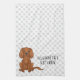El original ilustracion personalizado de Destei de un lindo color de rubí Cavalier Rey Carlos español perro de raza que está sentado. El fondo tiene un patrón de huellas de perros grises. También hay un área de texto personalizable al lado del ilustracion del perro.