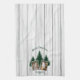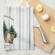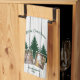 Rustic holiday kitchen towel with gray wood background and dark green trees. Photo templates via Pixabay licensed under CC0 and must be replaced with your own photo