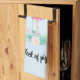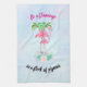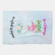 Una toalla de cocina con un lindo dicho: sé un flamingo en una bandada de palomas. Diseñado con el ilustracion de una mami y un flamenco rosado de bebé sobre una cama de flores suculentas florales con palmeras verdes que se balancean por la espalda. Tropical y bonito. El fondo es una acuarela azul veraniego con toques de violeta.
