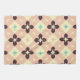 A seamless geometric pattern with cream, beige, and mint green shapes. Bold, dark brown floral designs form a repeating diamond grid. Retro vibe.