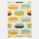 A seamless geometric pattern features vertical, oval shapes in soft yellow, teal, peach, orange, and brown, creating a retro, playful vibe.