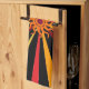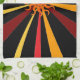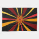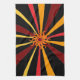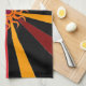 Esta toalla de cocina tiene un patrón geométrico abstracto salvaje del sol y sus colores son rojo, amarillo, dorado, naranja y marrón sobre un fondo negro puro.