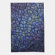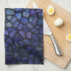 This vibrant kitchen towel features a close-up of an abstract mosaic pattern in shades of blue and purple, featuring irregular black outlines creating a stained glass effect with textured details. Finished in a mixed media art print.