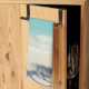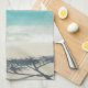 Una toalla de cocina con una hermosa fotografía soleada. Aguas del océano azul turquesa, con una playa de arena blanca. Un árbol tropical en solitario es un lugar agradable para relajarse y disfrutar de este paisaje idílico.