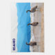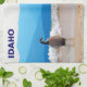 Una representación digital de tres Geeses de Canadá contemplan dirigirse hacia el surf entrante a la orilla del lago Pend Oreille en Sandpoint, ID; las montañas azules están a lo lejos. También aparece el texto "IDAHO".