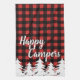 Tela escocesa rústica del control del búfalo en la toalla de cocina roja y negra que ofrece la frase "campistas contentos" y árboles blancos.