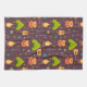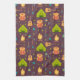Una toalla de cocina con un divertido patrón temático de camping. Sobre un fondo marrón rojizo. Los elementos en el patrón incluyen una fogata, una tienda, una guitarra, una pala y una mochila.