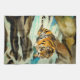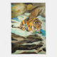 Pintura acuarela de un tigre de regal en invierno, haciendo una pausa para tomar una bebida de un pedazo de nieve derritiéndose. La primavera está muy cerca.