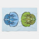Cute azul y verde gráfico triceratops rostros de dinosaurios decoran esta toalla de mano con una cara azul y una cara verde en ambos extremos.