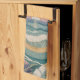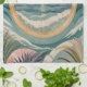 This vibrant, illustrative piece combines nautical scenery with mystical celestial symbols. At its center, a large circular window frames a tranquil sunrise or sunset over rolling ocean waves, rendered in a soothing palette of teal, seafoam, and lavender. Outside this frame, lush tropical foliage and palm fronds anchor the foreground, while the upper sky transition into a twilight scene featuring a golden crescent moon and shimmering stars. The artwork utilizes a mix of flat graphic shapes and soft watercolor textures, creating a peaceful, dreamlike coastal atmosphere that feels both modern and mythical.