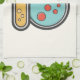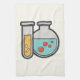 Una toalla de cocina con un bonito ilustracion de un tubo de ensayo que contiene líquido amarillo y un matraz/vaso de precipitados redondeados que contiene líquido verde con burbujas rojas.