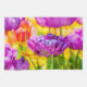 Tulipanes coloridos violeta, violeta y rosa sobre un lecho de flores. Prácticamente todos los colores del arcoiris presentes. Escena floral brillante y positiva. Fotografía macro.