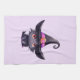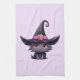 Una toalla de cocina con un divertido ilustracion temático de Halloween para los amantes del gato. Un gato negro de ojos grandes vestido con el gorra de una gran bruja negra con un cinturón rosado violáceo alrededor del borde.