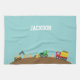 Los muchachos que aman los vehículos, los juguetes y las máquinas de la construcción van a amar este diseño que tenga porciones de elementos del tema de la construcción como un camión volquete rojo y amarillo lindo que lleva la ruina, un excavador anaranjado, un cargador delantero verde que empuja conos de la suciedad, del naranja y del blanco. Personalice con el nombre del niño.