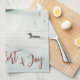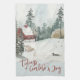 Toalla de cocina de Winter Landscape, con letras "Tidings of Comfort and Joy" en la tipografía de diseño. Este rústico diseño rústico presenta la acuarela de una casa a orillas del lago, pinos, un pato en el lago, nieve y un trineo.