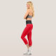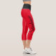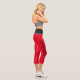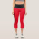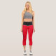 Leggings capri rojos y negros personalizados. Fondos de color sólido impresos en rojo con una cintura impresa negra. Están personalizados con un nombre personalizado impreso a lo largo y hacia arriba en el lado de la pierna derecha. Personalízalo editando el nombre de muestra para ajustarlo o cambiar a cualquier otro nombre que desees poner en estos leggings.