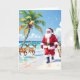 Una bonita tarjeta de Navidad de acuarela para pájaros de nieve o cualquier persona que viva en un clima tropical y escape del frío del invierno. Una ilustración de acuarela de Papá Noel en la playa con sus renos, rodeado de olas del océano azul y palmeras decoradas con luces de Navidad. En el interior de la tarjeta puedes agregar tu propio mensaje de vacaciones personalizado y subir una foto tuya o de tu familia.