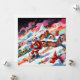 La imagen es contenido generativo. Lo que me gustó de esta imagen es que parece que Papá Noel se está escapando en esquí de la casa de pan de jengibre y está en el camino que sale de la casa. Hay texto editable en la parte posterior. También pensé que era genial que pareciera que tiene un bastón de esquí en su mano derecha.