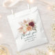 Envíe a los huéspedes a casa con un sincero agradecimiento usando esta elegante bolsa de favores de boda. Con flores románticas en burdeos, rubia y melocotón en un fondo blanco limpio, este diseño exhibe maravillosamente "Gracias por celebrar con nosotros" junto con sus nombres y fecha de boda. Ideal para bodas de otoño, celebraciones rústicas o temas de joyas de tono melódico, esta bolsa complementa perfectamente la suite boda Rustic Emerald & Burgundy Floral.