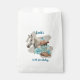 Esta bolsa de favores presenta un diseño de acuarela de caballo western con suaves acentos florales y elementos clásicos de vaquera, incluyendo botas de vaquera y un sombrero de vaquera. El rico fondo azul marino combinado con tonos turquesa y neutros crea un look western elegante que es perfecto para una fiesta de cumpleaños de caballos.