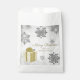 El regalo de paquete favorece esta temporada de vacaciones con una bolsa de Navidades de oro para favores. El diseño de las bolsitas favoritas incluye un regalo de Navidades envueltos vibrante adornado con copos de nieve grises y blancos sobre un fondo gris. También hay artículos de regalo y de vacaciones disponibles con este diseño.