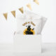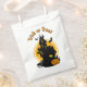Divertido truco de Halloween o bolso de regalo con una casa embrujada que tiene un campanario con murciélagos volando alrededor. Un gato negro aterrador y una lámpara tallada en el patio delantero y una luna llena en el fondo. Arqueado sobre la parte superior con letras en negrita y naranja es Trick o Treat.