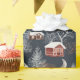 Cabaña con árboles de invierno y luna creciente sobre fondo gris oscuro.