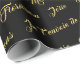 Las palabras y frases en francés cubren este papel envuelto en negro y oro con expresiones como "envío mi amor", "hermoso", "lleno de vida", "maravilloso" y más.