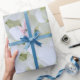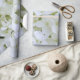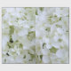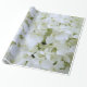 La hortensias es un arbusto glorioso y florido. Las flores pueden ser rosas, violetas, azules, cremas y, dependiendo del suelo, combinaciones mágicas de estos colores. En algunas variedades de hidrangea, el pH del suelo determinará el color. El azul requiere suelo ácido, con un pH de aproximadamente 5,0 a 5,5. El rosa o el morado requieren un suelo alcalino, con un pH de 6,5 a 7,0. El suelo neutro generalmente resulta en pétalos de color crema, pero también se puede obtener lo que algunos llaman "rubia" (azul y púrpura). Al igual que los grupos de pequeñas mariposas, las pequeñas flores se reúnen en esferas impresionantes. Se dice que la hidrangea representa la gracia, la amistad, la belleza espléndida y la preservación del amor que dura para siempre. Este último sentimiento es probablemente la razón por la que las hortensias blancas son tan populares para las ramas de novia. El patrón en este precioso papel de envolver se repite cada tres pies lineales, pero cada regalo envuelto se cubrirá con estas espectaculares flores blancas. Es una excelente elección para cumpleaños, aniversarios y el Día de la Madre y una muy buena opción para duchas nupciales y regalos de boda.