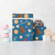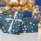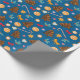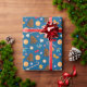 Papel envuelto con un patrón de Año Nuevo, lindas fotos de caramelos, copas y galletas de jengibre, arcos y hojas sobre un fondo azul.