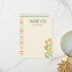 Envía un mensaje de agradecimiento después de las fiestas de cumpleaños o eventos especiales con esta papelería plana inspirada en la naturaleza que presenta texto fácil de editar. Cambia el titular de "gracias" a un mensaje de tu elección y edita el texto del nombre para un regalo verdaderamente único. Encantadoras flores ilustradas de color amarillo de craspedia bill ball florecen en la parte frontal con un pequeño detalle de mariquita, mientras que la parte posterior presenta una franja de colorido arcoíris de colores inspirados en el retro y neutrales en cuanto al género, como el verde menta, el azul cielo, el óxido, el amarillo dorado y el rojo coral sobre un fondo cremoso.
