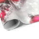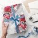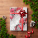 Papel de embalaje atractivo del navidad con los ornamentos purpurinoso rojos hermosos del navidad, las luces chispeantes blancas, las perlas de plata brillantes y la malla.